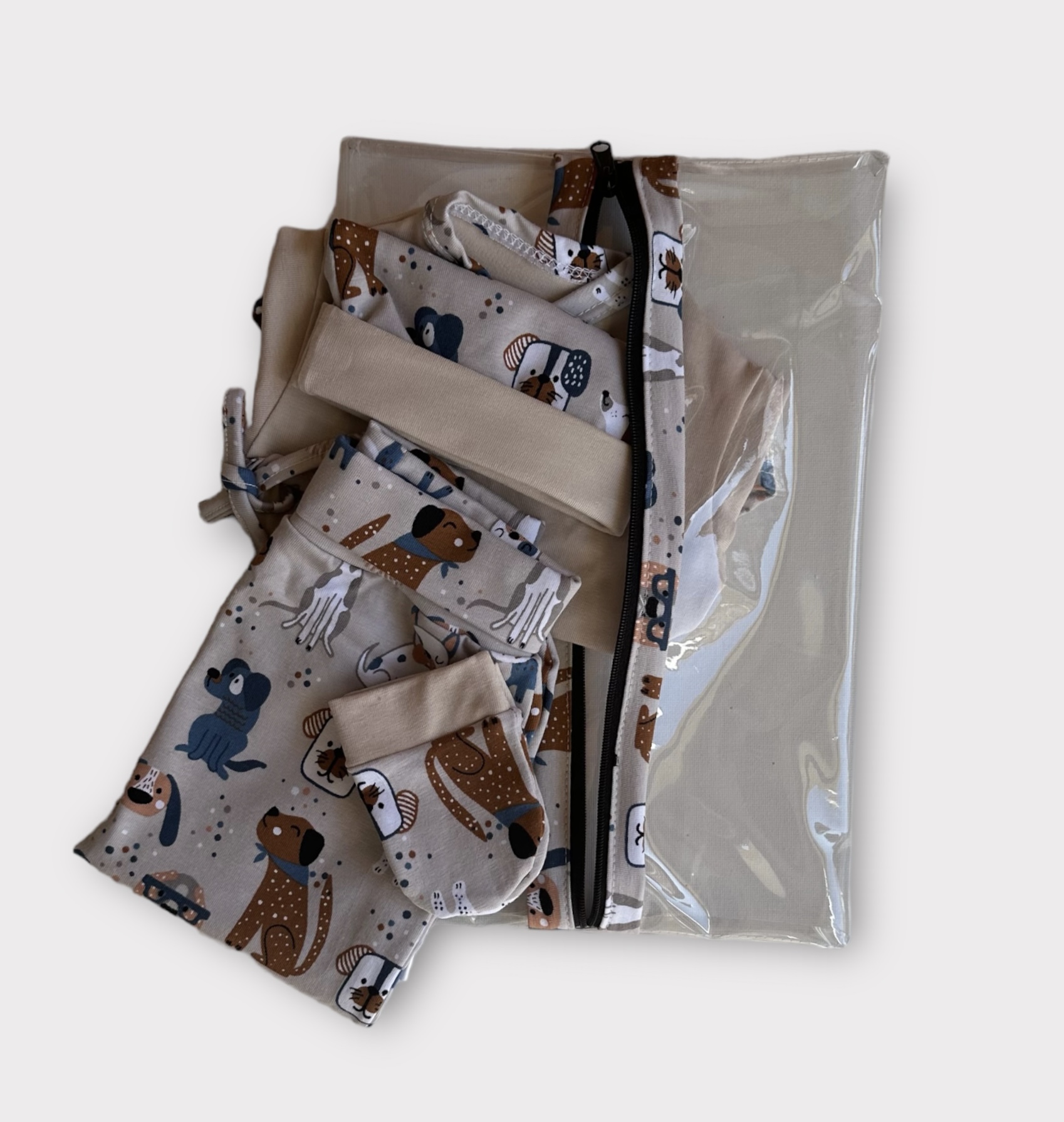 Babygrow, calças, luvas, gorro e bolsa.