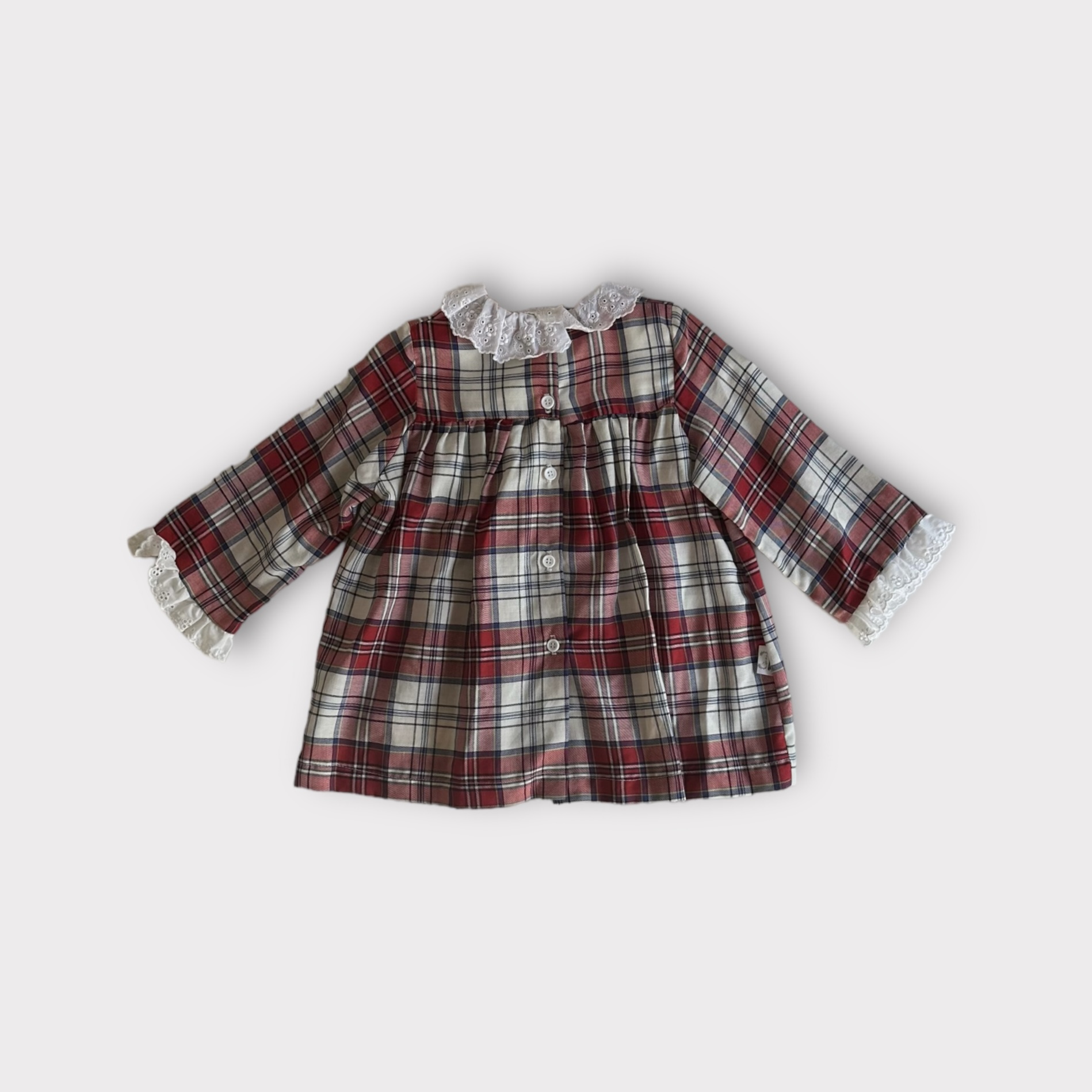 Vestido de xadrez, com bordado inglês na gola e mangas.